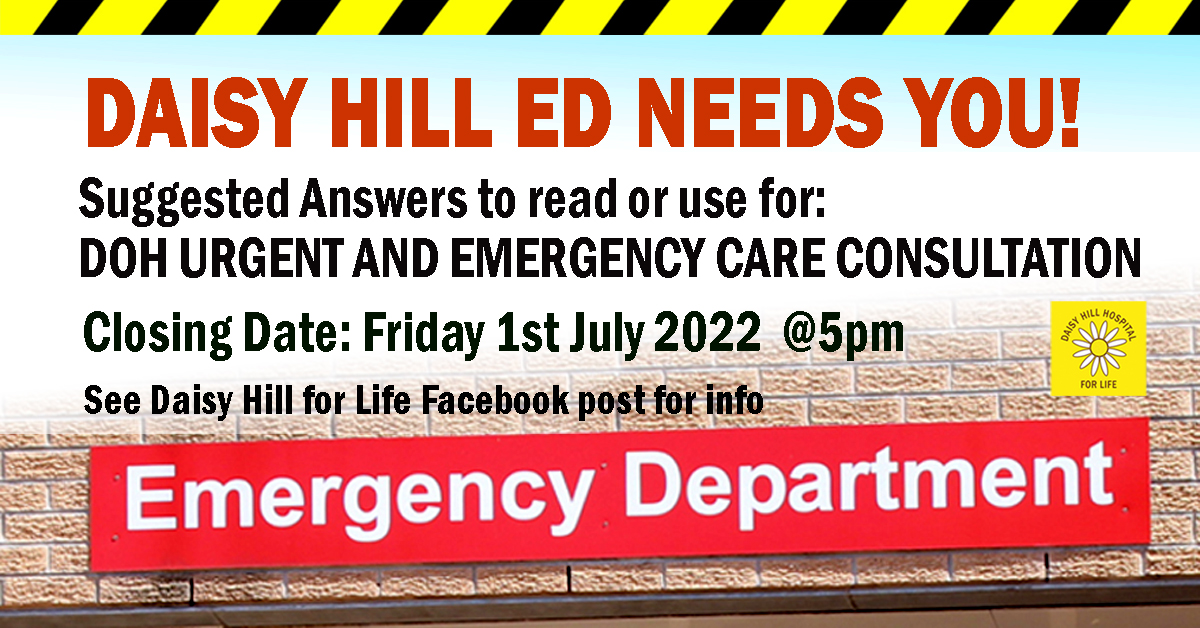 If you would like to help by Submitting a Response to the Urgent and Emergency Care Services Consultation, or are short on time and would like some ideas – please read the Daisy Hill for Life on Facebook and this website