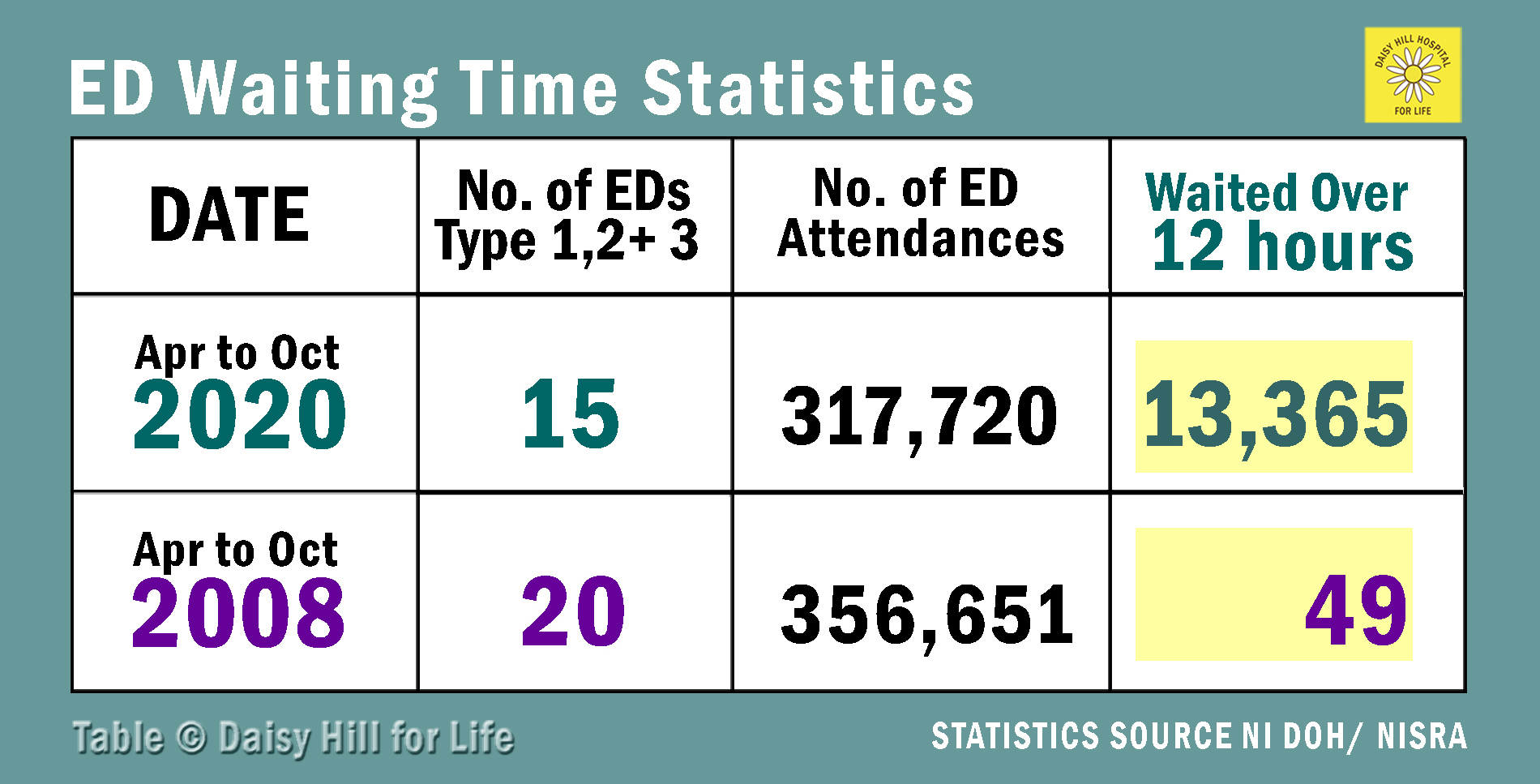 ED waiting time stats show that 13,365 people waited over 12 hours between April and Oct 2020 when there were 15 Emergency Departments in Northern Ireland.  In comparison 49 people waited over 12 hours between April and Oct 2008 when there were 20 EDs in Northern Ireland. (Type 1, 2 and 3 EDs) Statistics from Department of Health NI