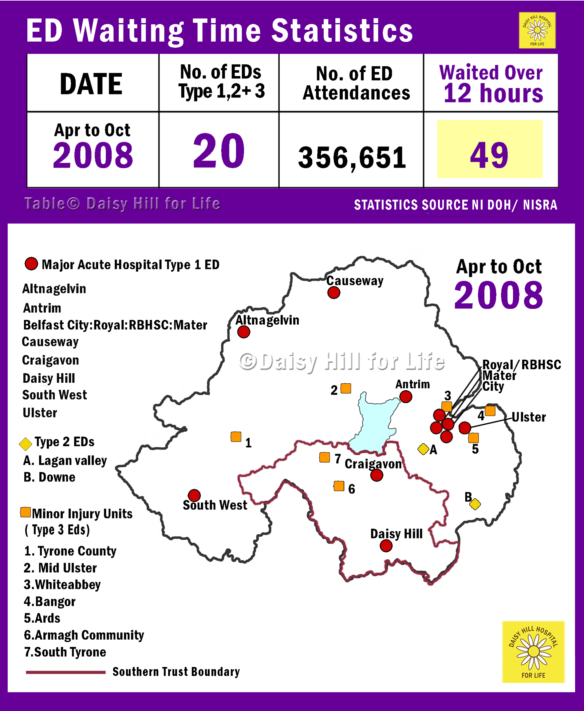 ED waiting time stats show that 49 people waited over 12 hours, from April to October 2008 when there were 20 Emergency Departments in Northern Ireland. (Type 1, 2 and 3 EDs) The locations of the 20 Type 1, 2 and 3 Emergency Departments in April to October 2008 are shown on NI map.