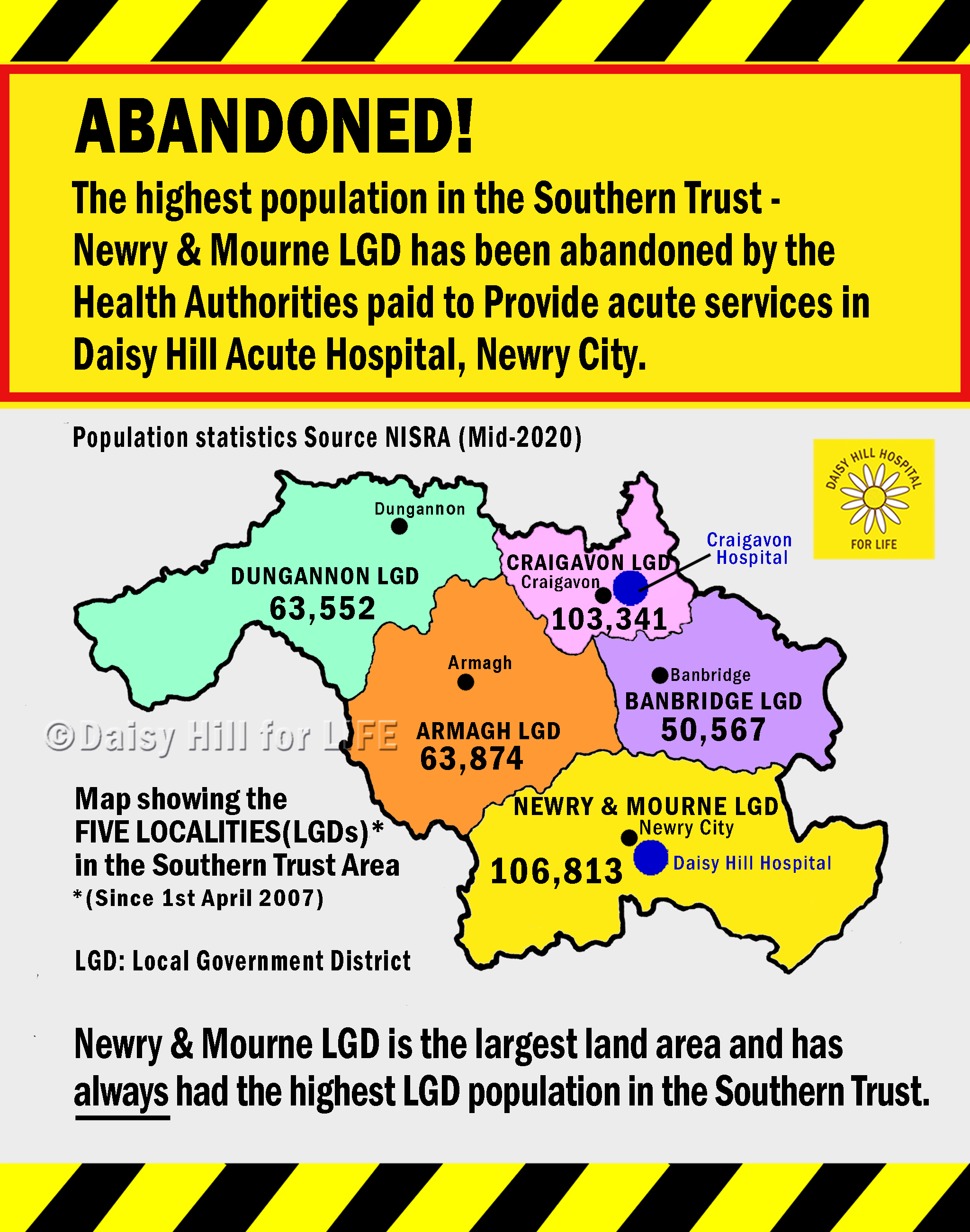 Ref 4 – Newry & Mourne LGD has ALWAYS been the highest locality population of the 5 LGDs in the Southern Trust operational area. (* Ref4 : Source NISRA). For more information and data on this – pls see: https://savedaisyhillhospital.com/2020/02/04/newry-mourne-local-government-district-lgd-ranks-in-the-top-4-lgds-in-all-northern-ireland-consistently-since-1971-so-where-is-the-matched-funding-for-daisy-hill-acute-hospital-newry/