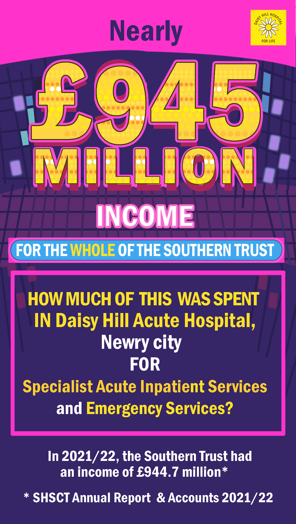 The Southern Health and Social Care Trust, with an income of nearly £945 million public money in 2021/22 has the function in Law to provide hospital accommodation (beds) and services for people in ALL the FIVE local government districts in the Southern Trust operational area (in order of population size, starting with the highest: Newry & Mourne, Craigavon, Armagh, Dungannon and Banbridge).