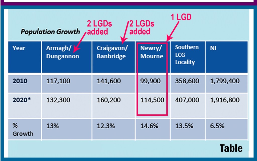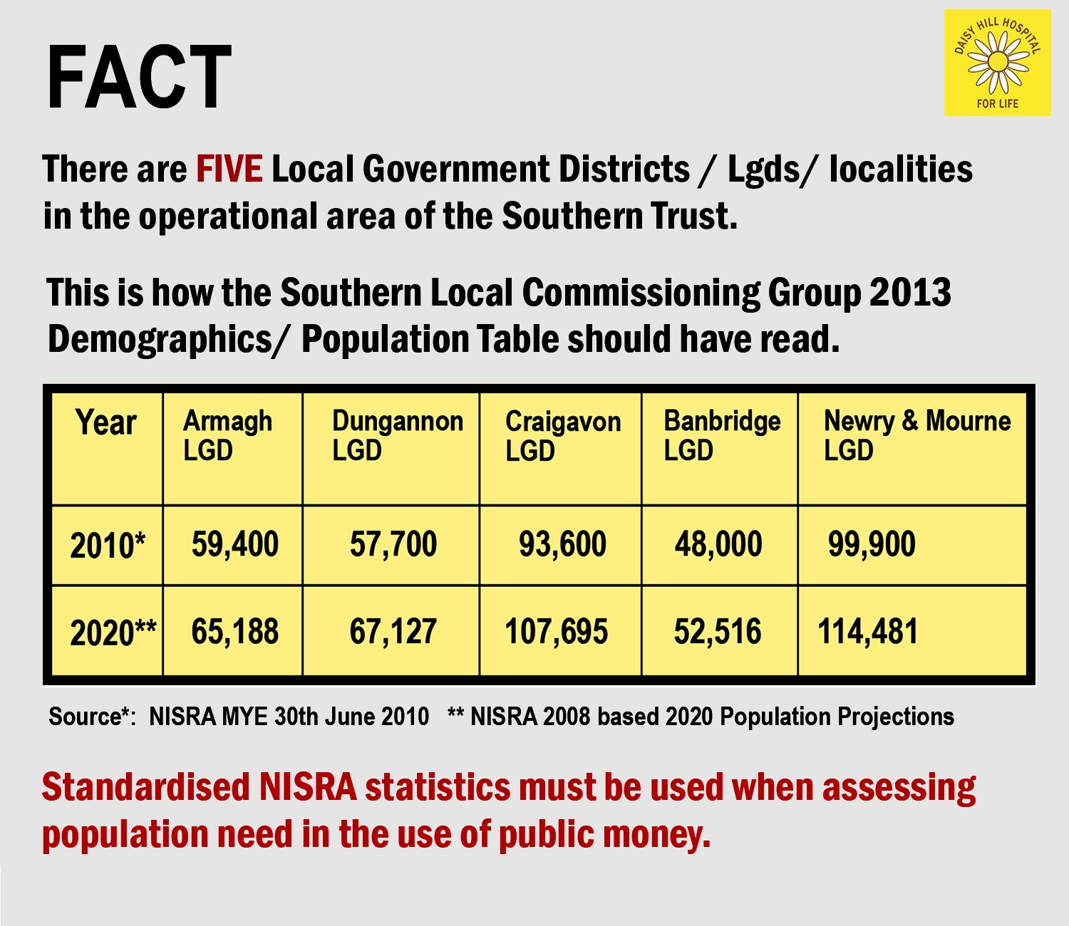 Yes this is correct – Newry & Mourne LGD has ALWAYS been the highest locality population of the 5 LGDs in the Southern Trust operational area (NISRA) (* Ref4) , however the Southern Trust simply will not allocate the appropriate investment on hospital buildings, services, equipment or staff in Newry & Mourne’s Acute Area Hospital – Daisy Hill.