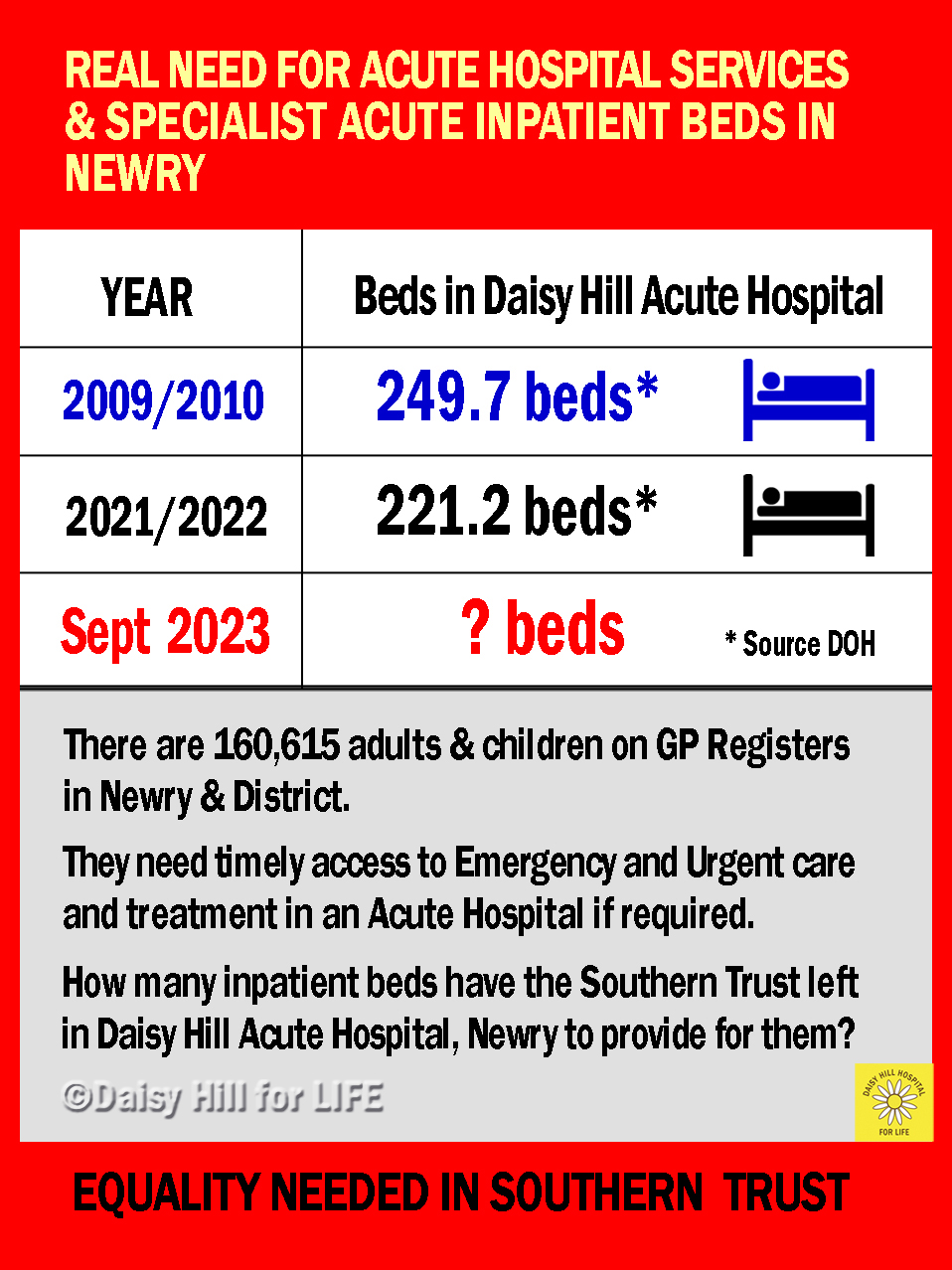 There were 249.7 beds in Daisy Hill Hospital in 2010*(Ref1) but by September 2023 the Southern Trust has cut the number of inpatient beds dramatically and is now fast tracking centralisation to Craigavon despite the size and need of the larger population in Newry & District.