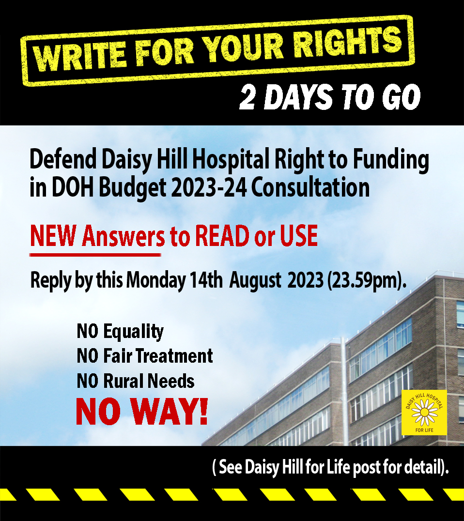 Reply notes: Replying to this DOH Budget 2023-24 Consultation and Liking and Sharing these posts can help support all Daisy Hill Hospital campaigns. Thank you.