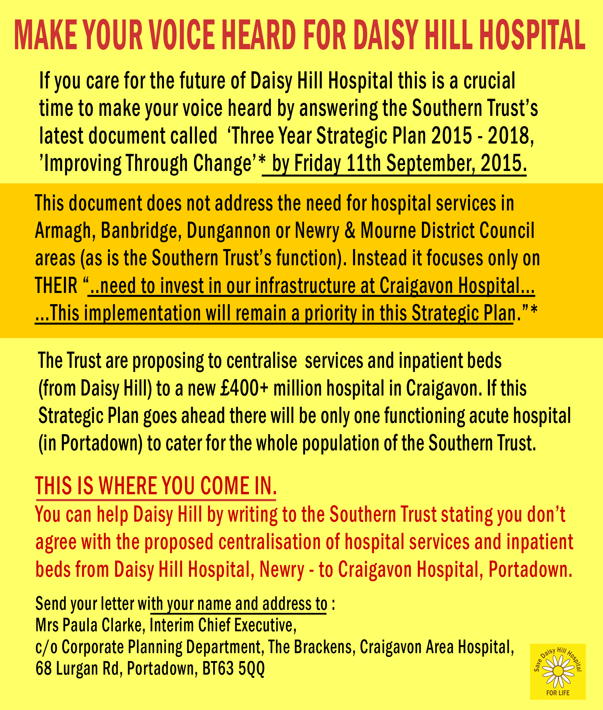 To read the documents in full click here for the Southern Trust 3 year Strategic Plan 2015-2018 -on ‘Improving Through Change – 2015 – 2018’ The Trust have invited views on their plan so this is our opportunity to reach them. Remember the money allocated to health and hospital services is allocated according to population statistics and it is our democratic right to speak up for our hospital services.